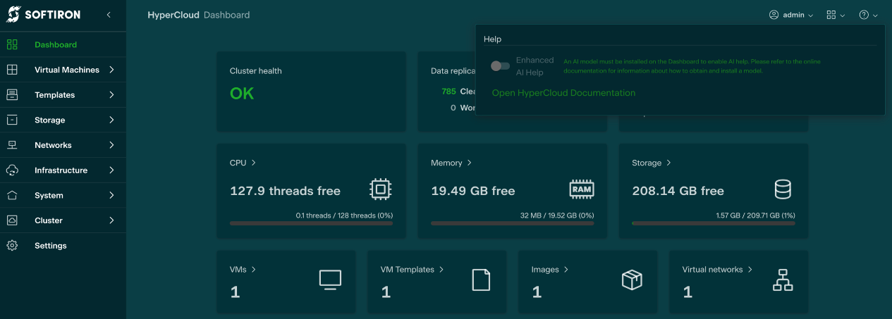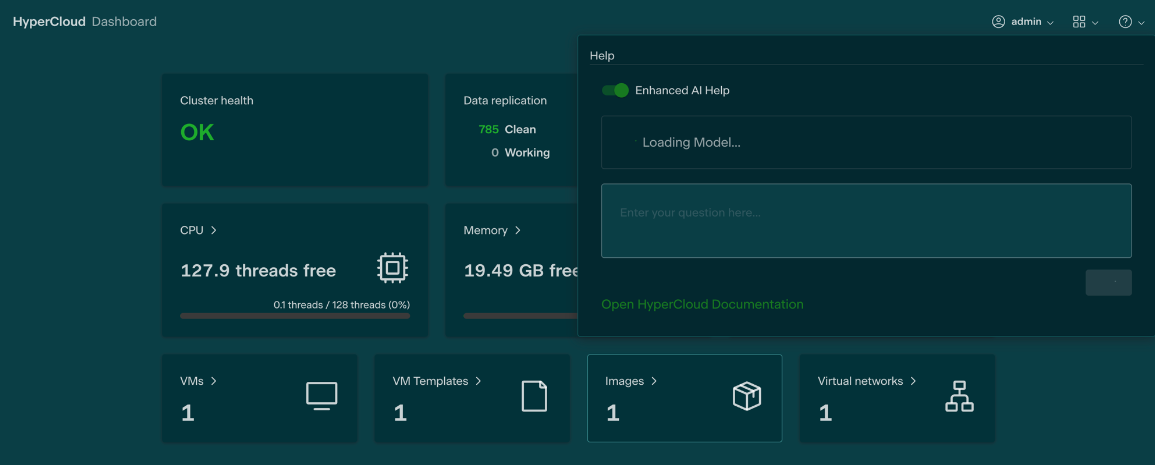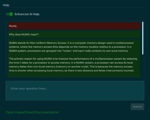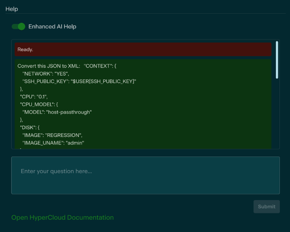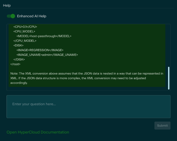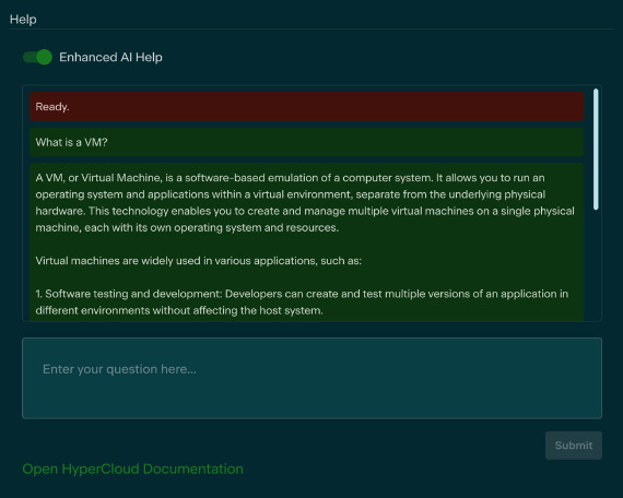 HyperCloud offers the ability to install an AI Chatbot into the Glasshouse web GUI for users to ask questions about the interface and how to accomplish task within the infrastructure.