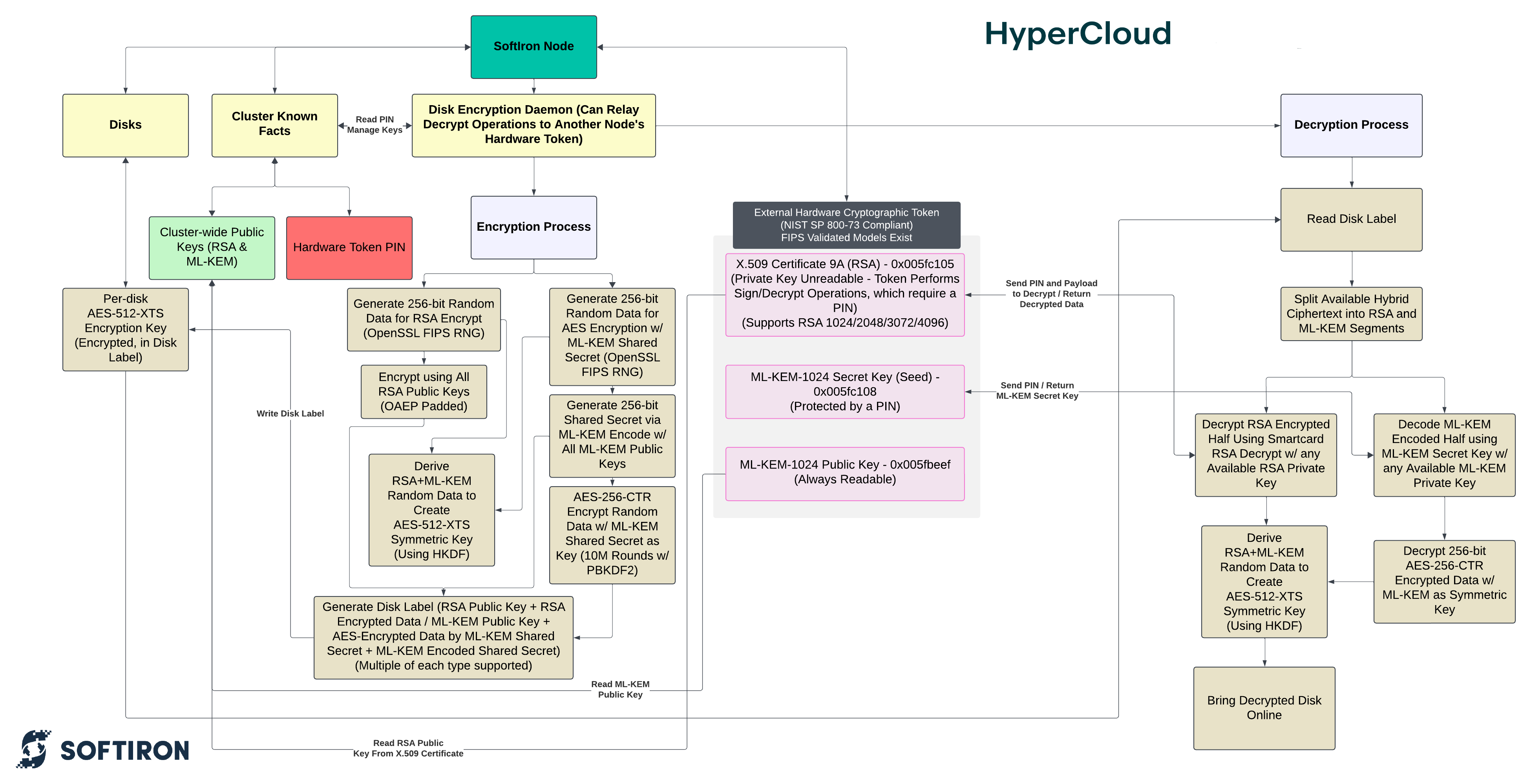 PQC FDE on a SoftIron cluster is completely self-contained, internal to the cluster itself on its static nodes. Still making use of a USB interfacing token, the disks' header labels are further obfuscated behind a hybrid RSA and ML-KEM key pairing.