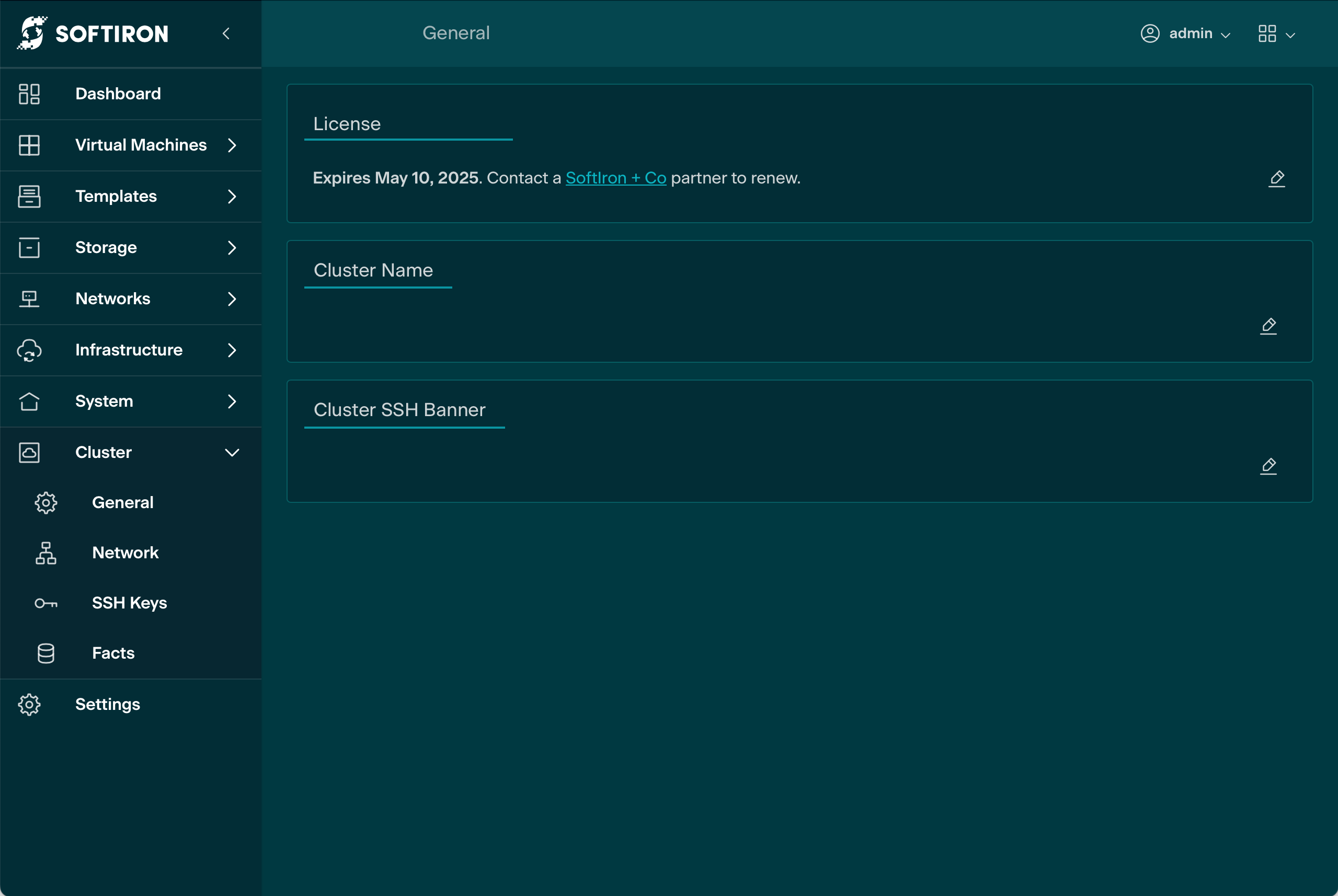 To update the Cluster License navigate to the Cluster/General panel in the Glasshouse GUI.