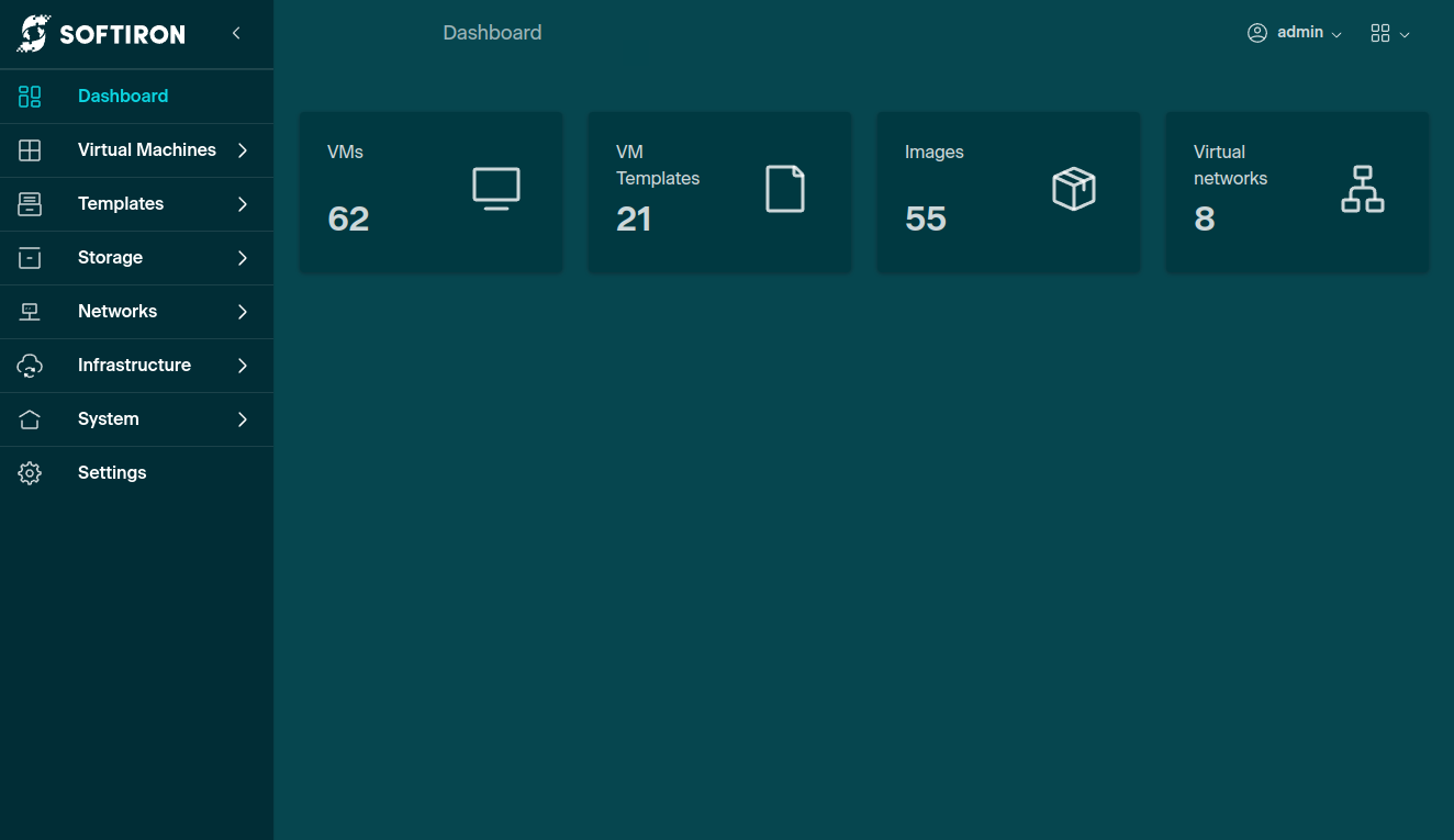 An administrator view of the SoftIron cluster dashboard, providing a quick overview of VM instances, users and groups, images, virtual networks and hosts, along with their resources.