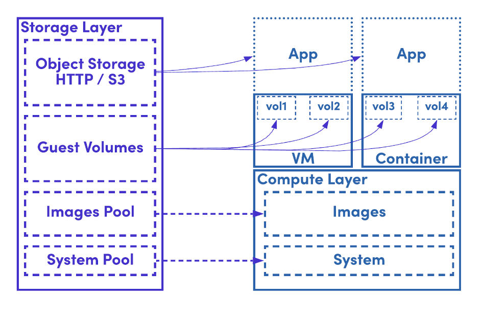- Guest layer block storage: Persistent storage for virtual machines and containers.