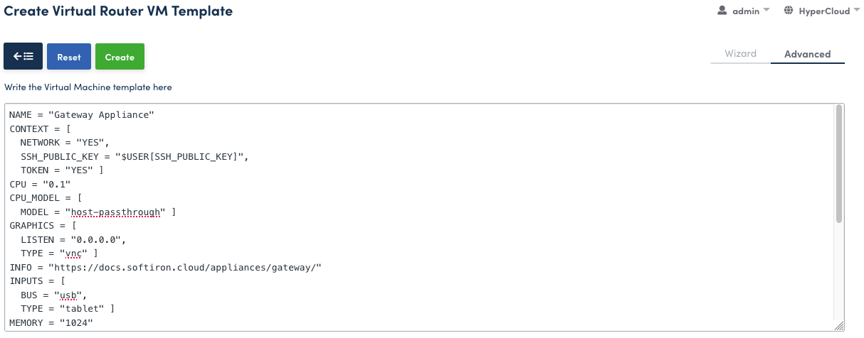 To easily setup the Template, the template configuration will also be copied from the WebGUI to be pasted in the Dashboard's GUI. Since the Gateway Appliance is classified as a Virtual Router, navigate through the dashboard to create a virtual router template. From here, enter the Advanced setup and paste the configuration into the