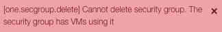 As with most created objects in HyperCloud, the Security Groups cannot be deleted while being used by another device, i.e. a Virtual Machine. It will need to be removed or replaced on the device before issuing the delete command.