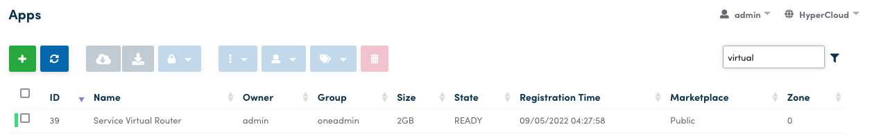 Select the App and Import to the default Datastore by clicking the Import to Datastore button. This will allow the Template to be instantiated and used for bridging Virtual Networks. This special Virtual Machine Template contains and implements various Virtual Network Functions (VNFs) that process the context information from the HyperCloud infrastructure.