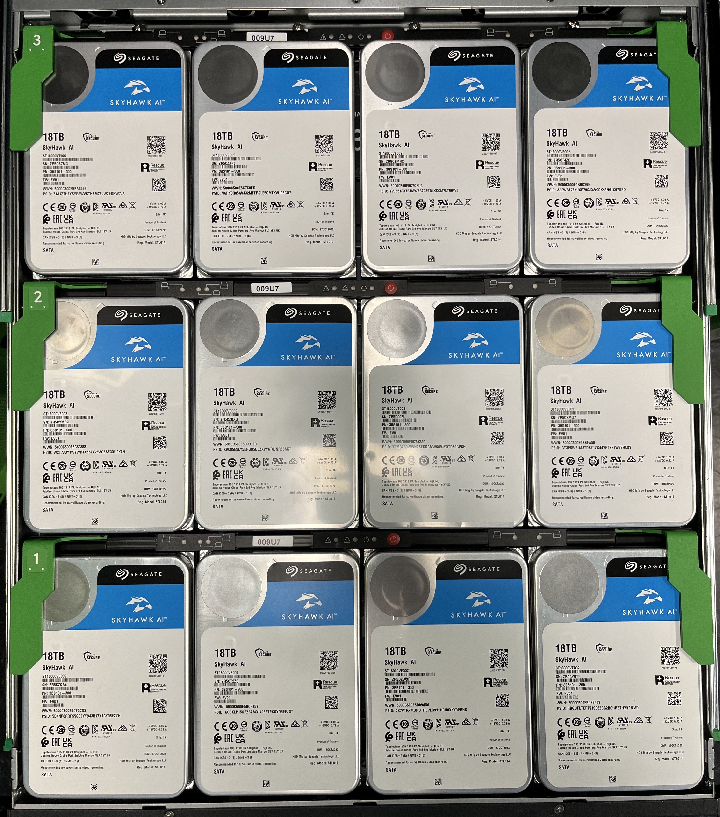 In the image above, you can see how the devices above map to the physical disks. The "slot" numbers are left to right, that is, the disk in the bottom left corner is caddy 1 slot 1.