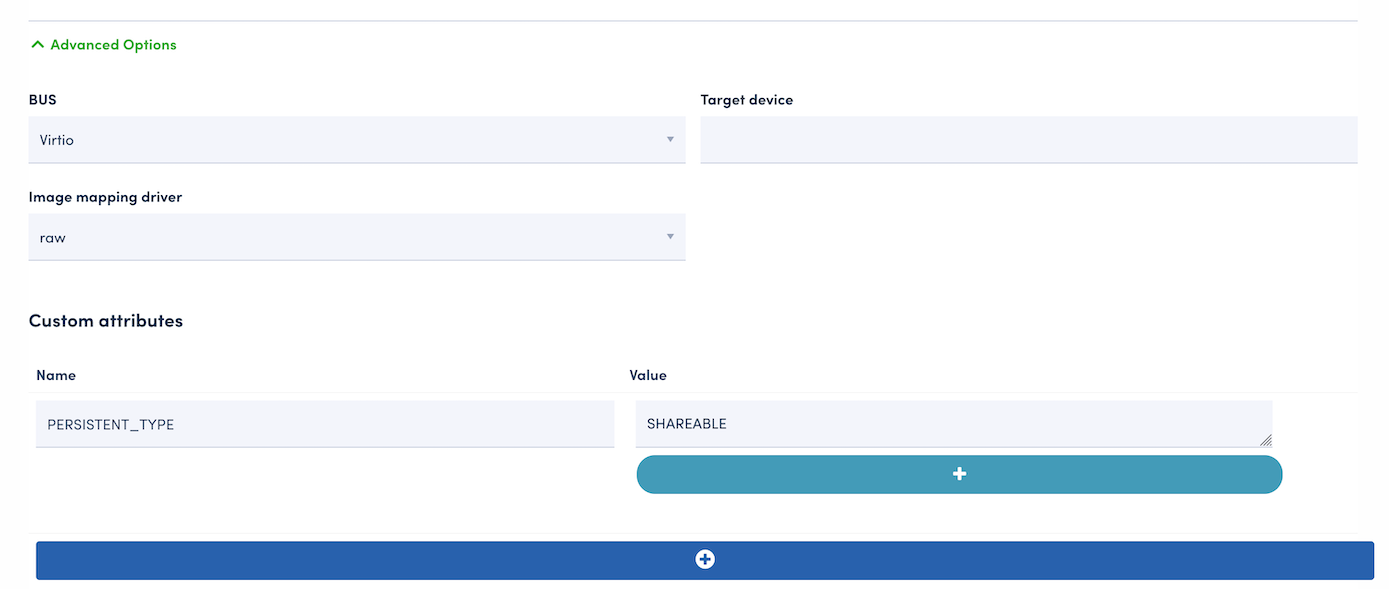 Expand the Advanced Options and input the attribute PERSISTENT_TYPE with the value of SHAREABLE, click the blue circled + button at the bottom of the field.