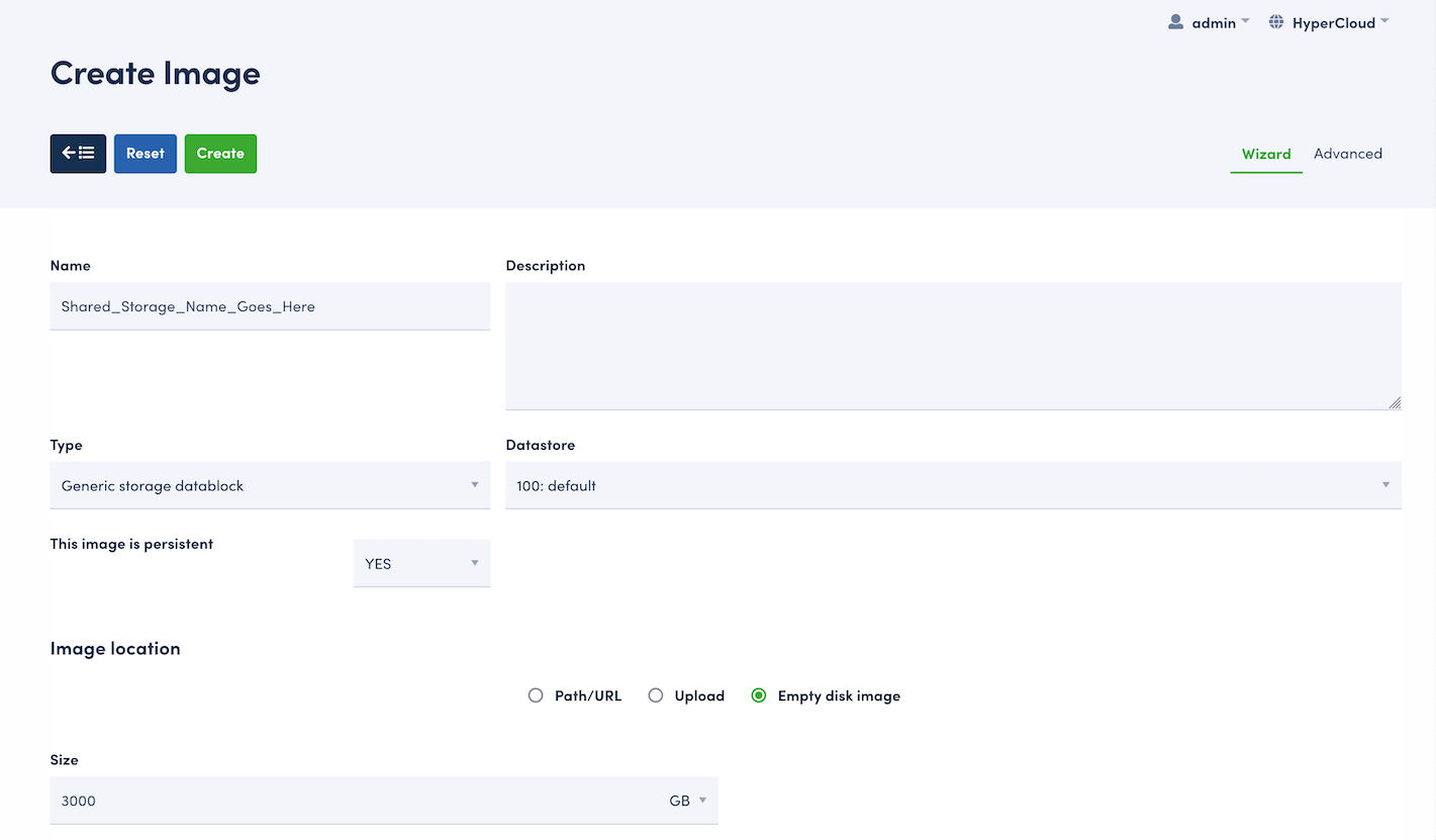 From the HyperCloud GUI, navigate to the Create Image Wizard where a Name and Description can be given to the disk. Set the Type to Generic storage datablock and set the Image to persistent and Empty disk image