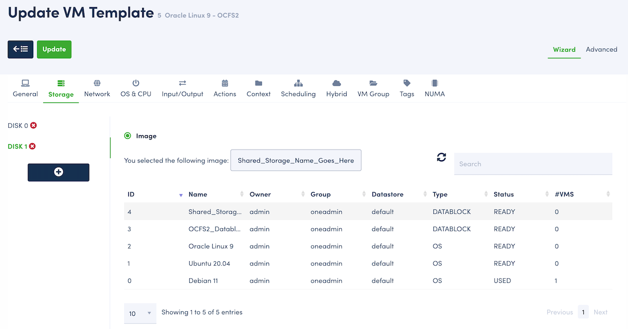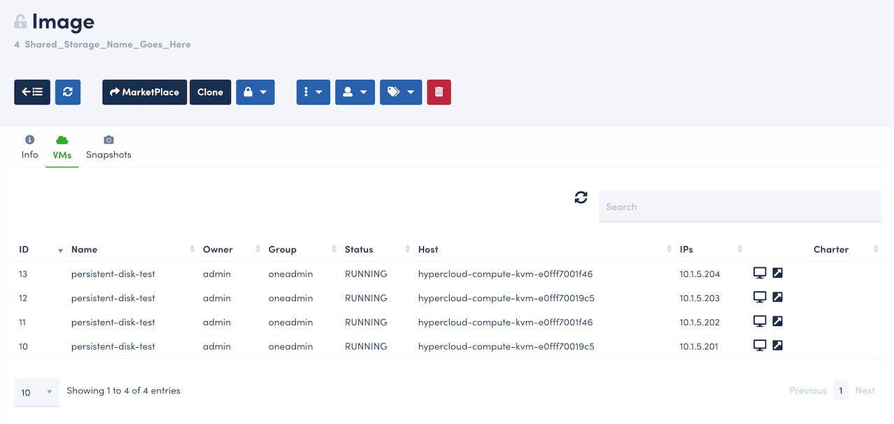 Navigating back to the Image list under the Storage menu, select the shared datablock and click VMs to show the list of VMs that the disk has been attached.