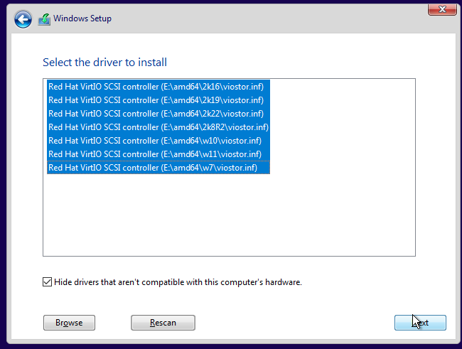 No discs will be available and you will need to load the drivers. Click the Load Driver button and select all VirtIO drivers; these will need to be installed to access the Windows Datablock Disk. The setup will progress and install the OS, this will take some time. Afterwards, the Wizard will restart the machine and proceed to the next step in the installation.