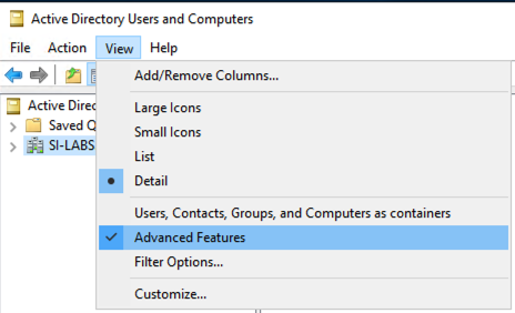 If desired, the distinguished names can also be obtained directly from the Active Directory Users and Computers MMC 1. Ensure that the Advanced Features view is enabled ADUC Advanced Features