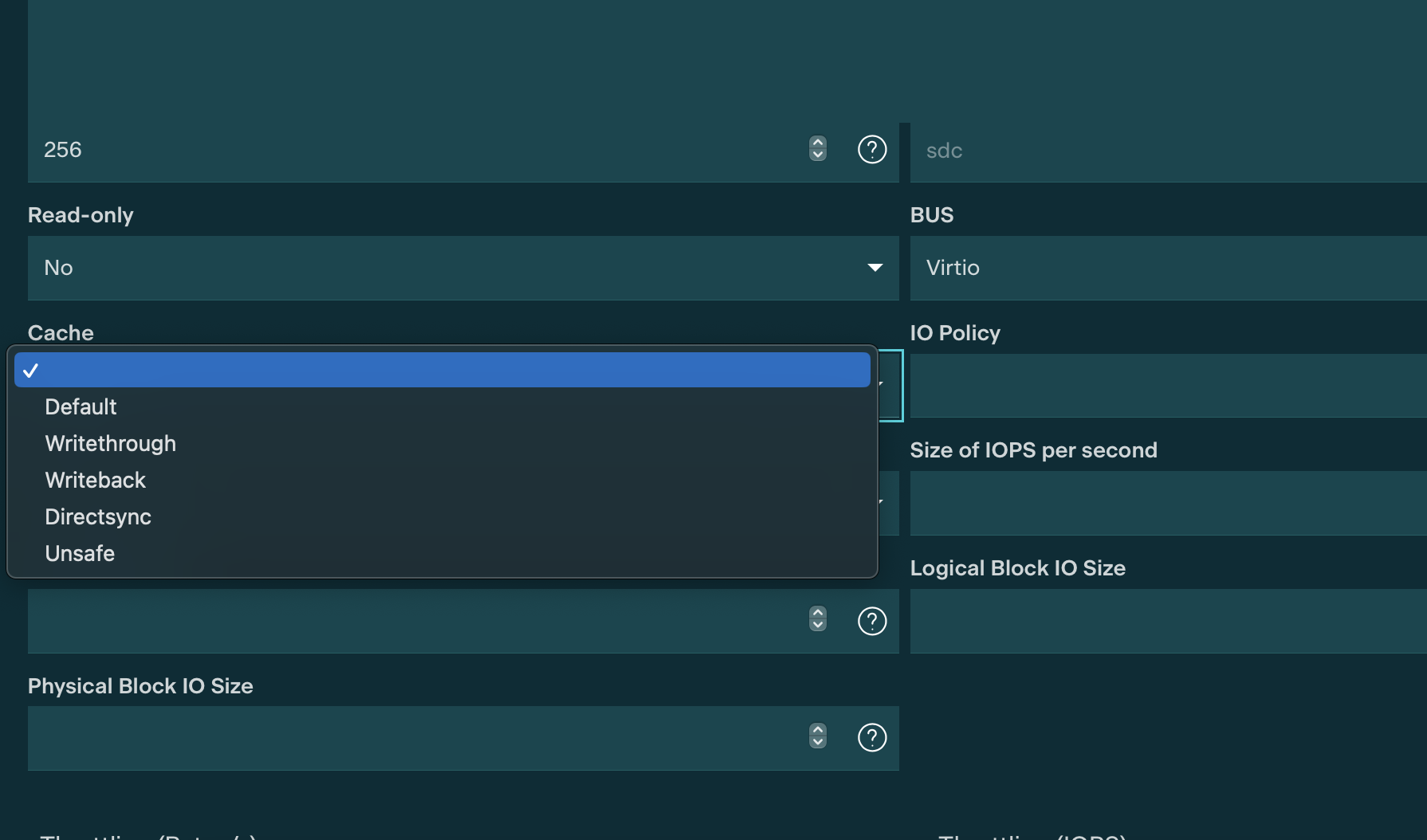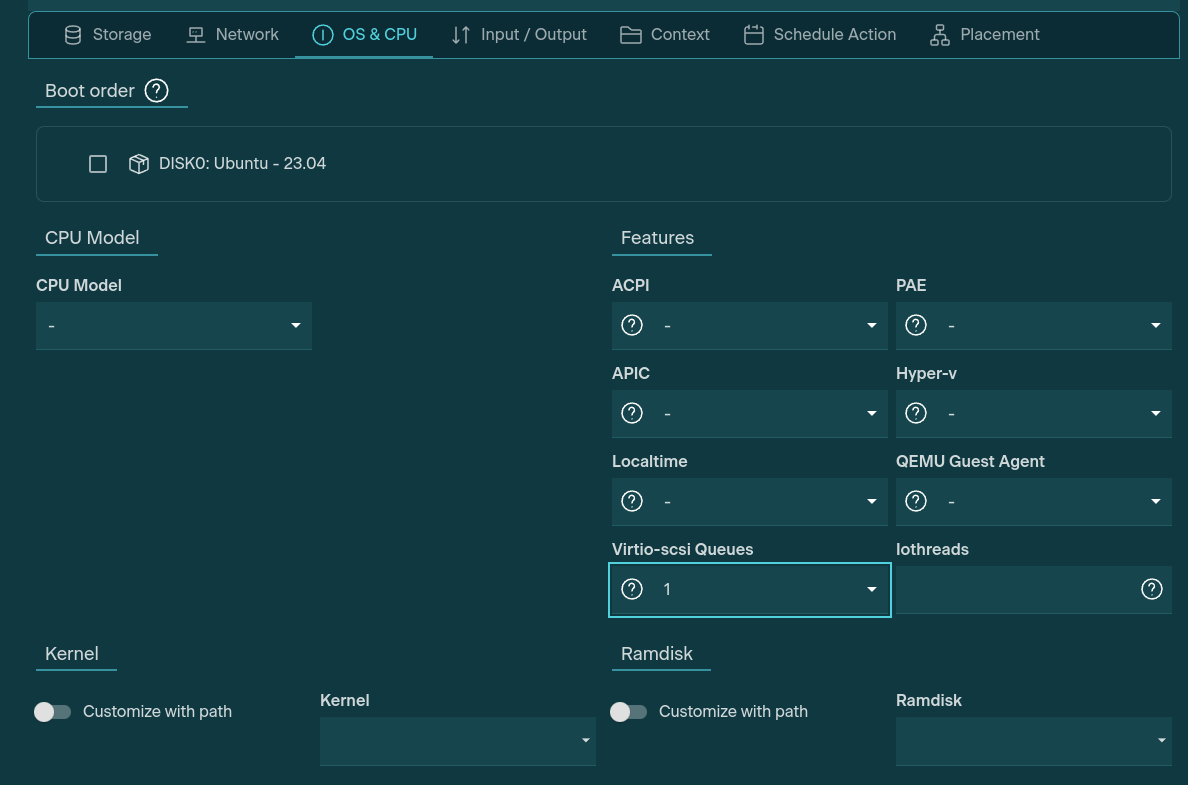 To enable VirtIO-SCSI, make sure your OS supports it (all modern Linux kernels support this) and set the Feature Virtio-scsi Queues under OS & CPU to a non-blank value matching the number of CPU cores to use for I/O. Ideally this should match the number of logical CPUs in the VM.