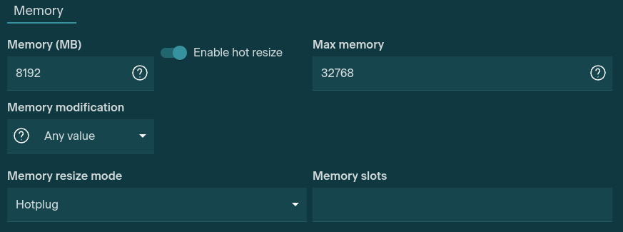The VM will be deployed with 8GB of usable RAM but we will have the option to increase the RAM whilst running. Select Enable hot resize to use this option. Note that the slot number option is no longe required and will be removed in future releases.