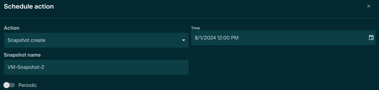 The final place within the GUI that can trigger snapshots of either the individual disks or the whole VM is the Actions Tab. From here, by selecting add action button, a scheduled action can be created to enact a VM command on a one-off or periodic frequency; such as, taking snapshots.