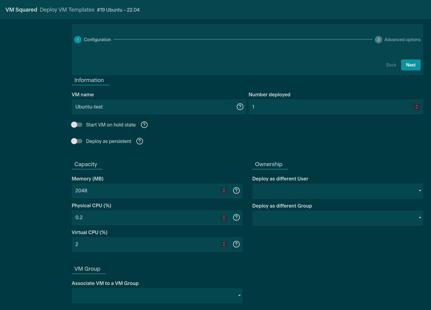 Undeploy | Shuts down the virtual machine, and removes the CPU and RAM resource allocation, but keeps the instance in VM Squared including data disks. This is useful as a non-destructive way to save resources. |