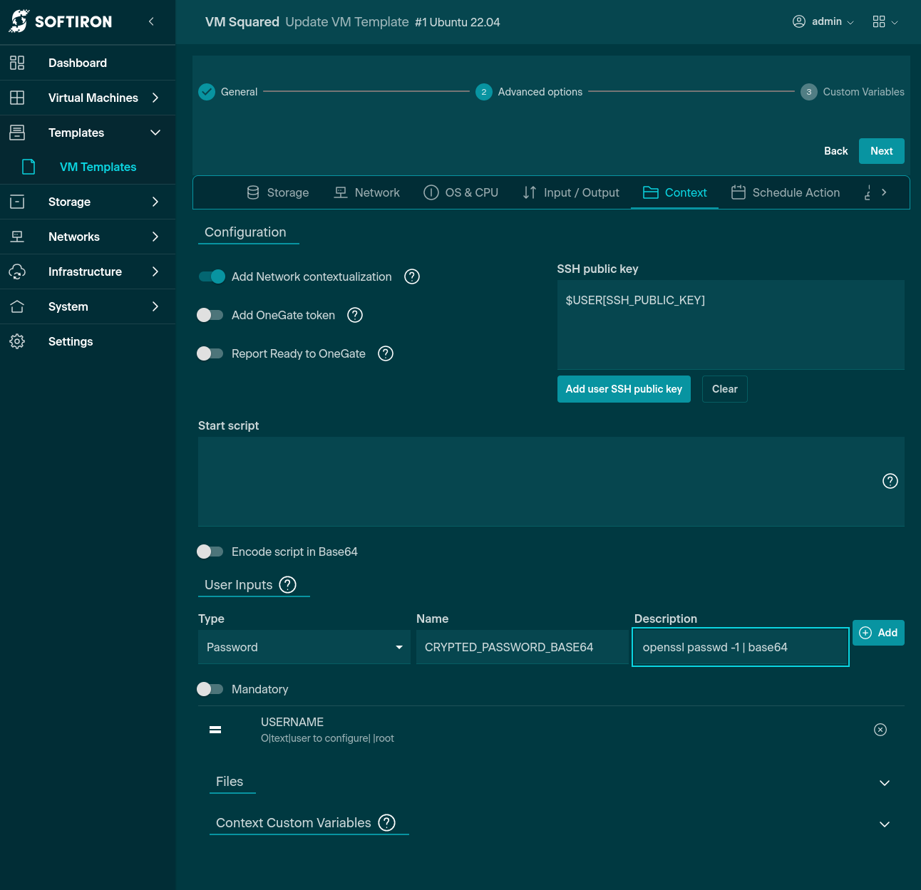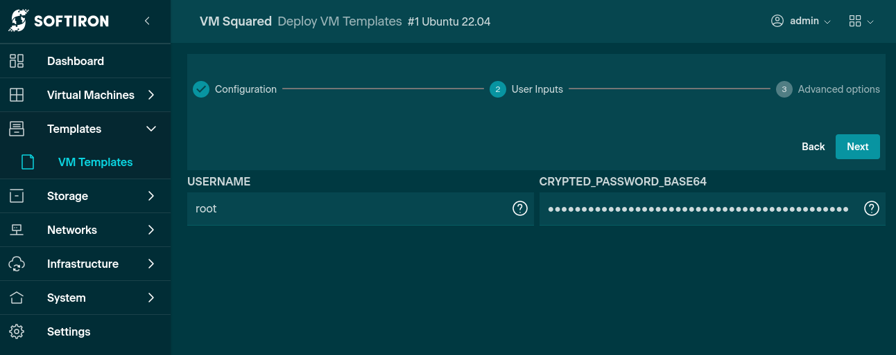 When deploying the VM Template, since additional template context was added, there will be an extra step for User Inputs, this is where the password data is entered for the VM.