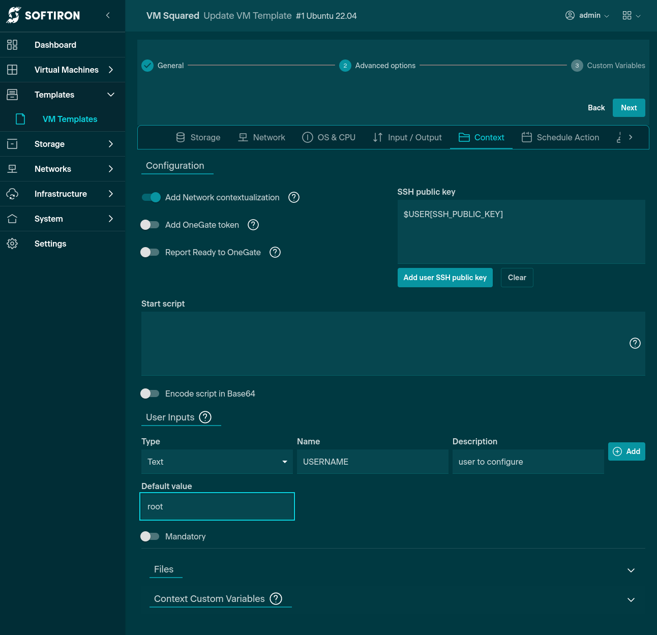 In the User Inputs section, create two new fields. First, add a field with Name USERNAME, the Input type: "Text", and the default value of the user that will receive the context during instantiation. Click Add before moving on to the next field. The Default value field is optional, but will need to be provided a value before deploying the VM.