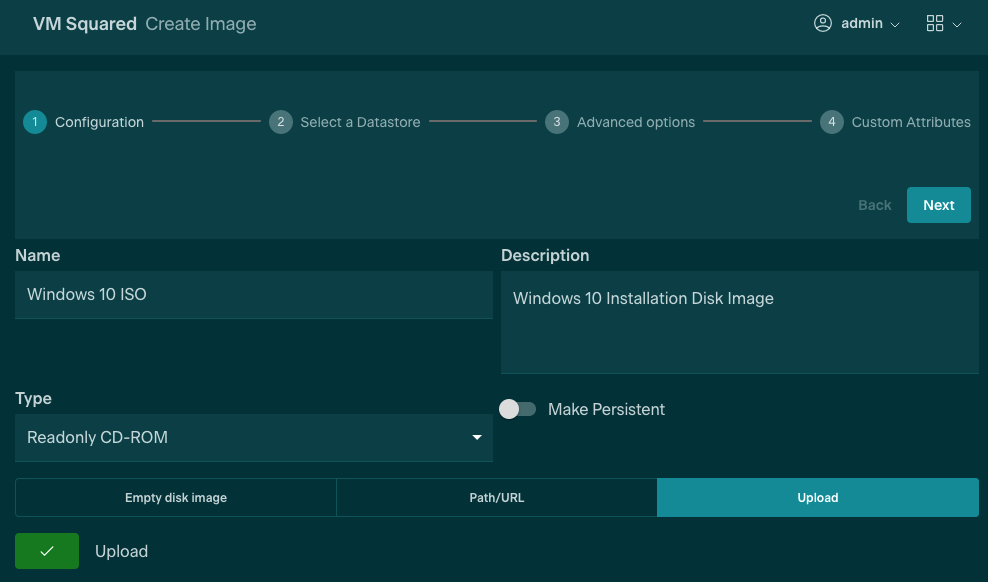 At this point, these files reside on a local machine and need to be uploaded to the cluster for further use. This can be achieved via a straightforward upload to the datastore or, without downloading to a local machine, by directing the Image Creation Wizard to the designated URL for direct download and import into the Datastore.