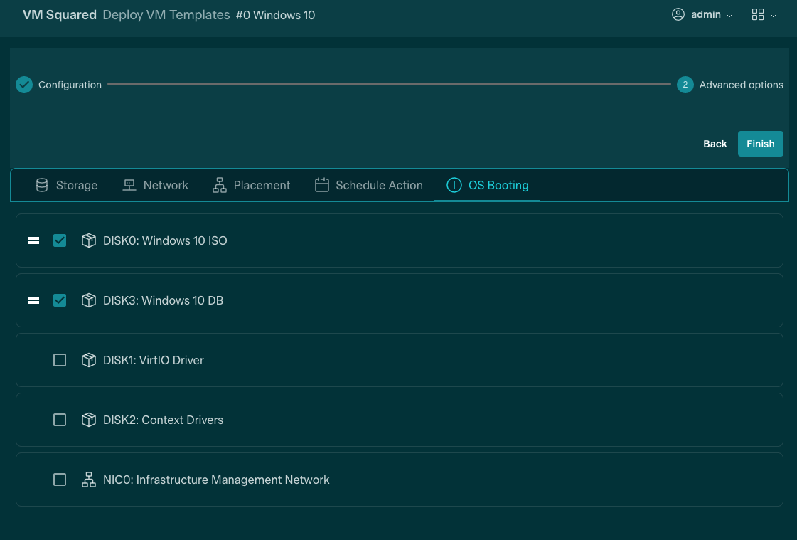 The Template is now ready to be created by pressing the Finish button in the top right of the window. The Windows 10 VM Template is now available to be instantiated from the Templates → VMs menu.