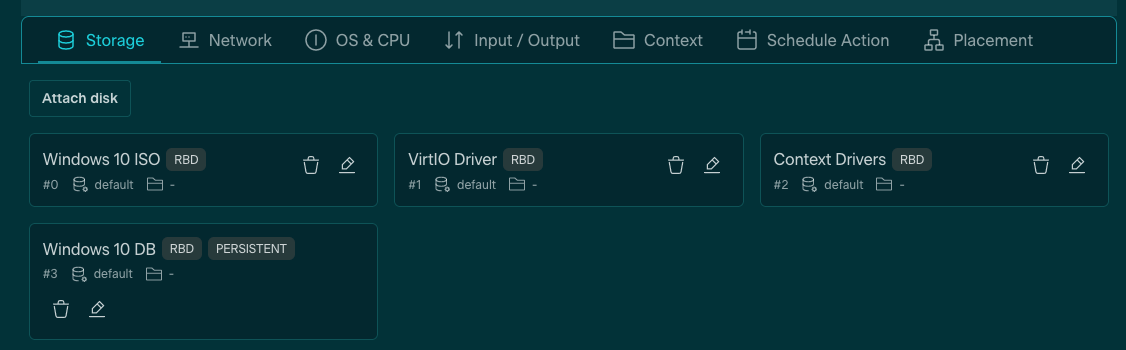 The ISO (CD-ROM), VirtIO, and Contextualization Images can be removed as disks under the Storage Tab within the VM Template, leaving the new OS Image (formerly Disk 3, generic storage datablock) as the only disk available to the Template, and the success can be tested by instantiating a new VM with the updated Template.