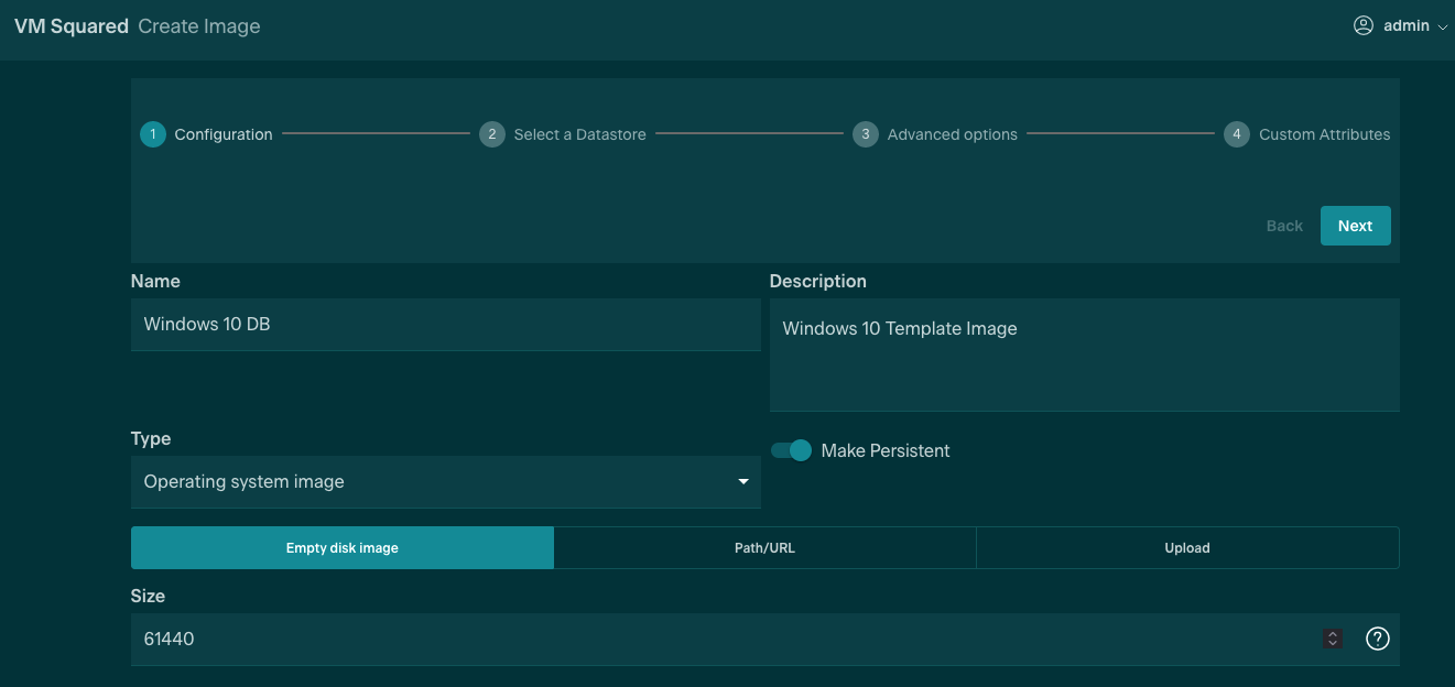 Finally, create an empty disk used for the installation of the operating system. This will need to be classed as an Operating System image, but select the contents to be empty and marked as Persistent. This persistence severs the link between the original Image and any clones, allowing any modifications made to the clone to persist after Termination of the virtual device, and will allow the creation of the Template.