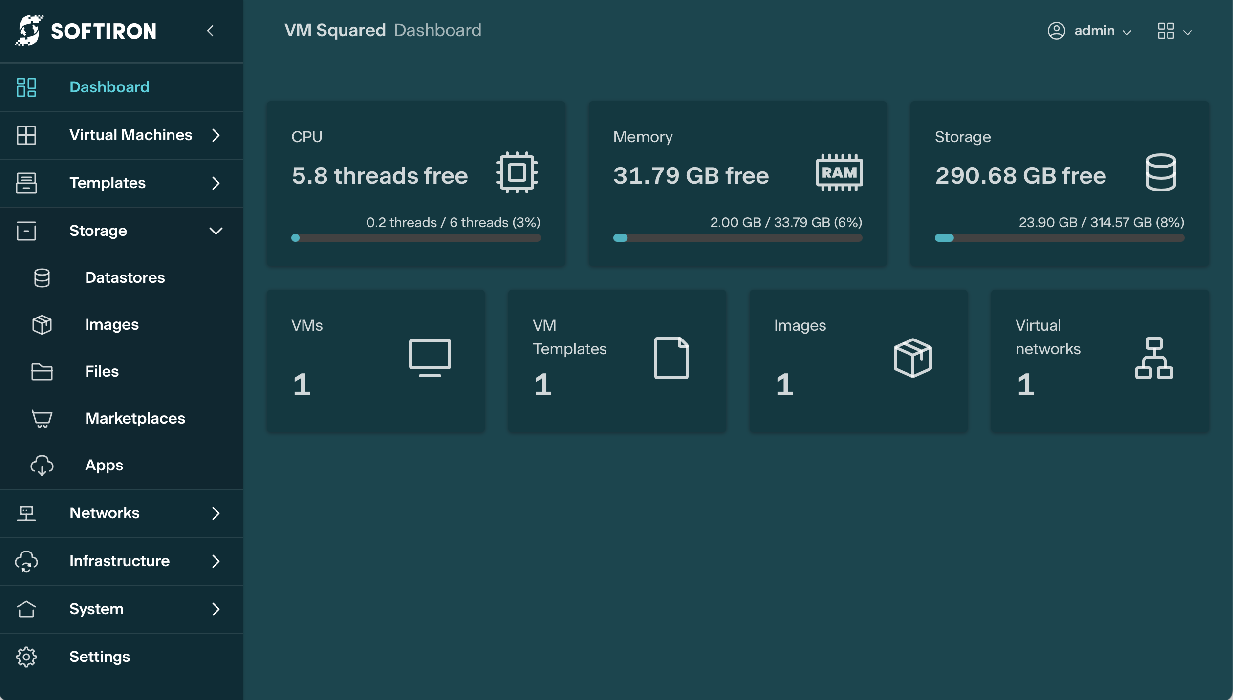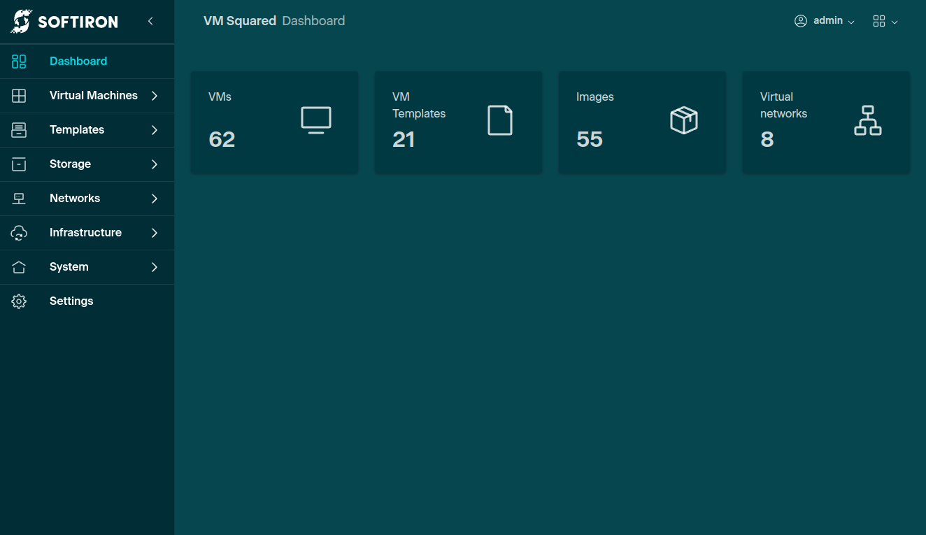An administrator view of the VM Squared dashboard, providing a quick overview of VM instances, users and groups, images, virtual networks and hosts, along with their resources.