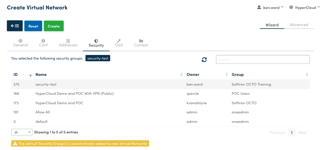Select a Security Group from the list. Security Groups act as a firewall to limit inbound and outbound traffic. Rules can be set for specific Protocols, Port Ranges, and for Target Network; however, with Virtual Networks, they can be used to limit IP address access.