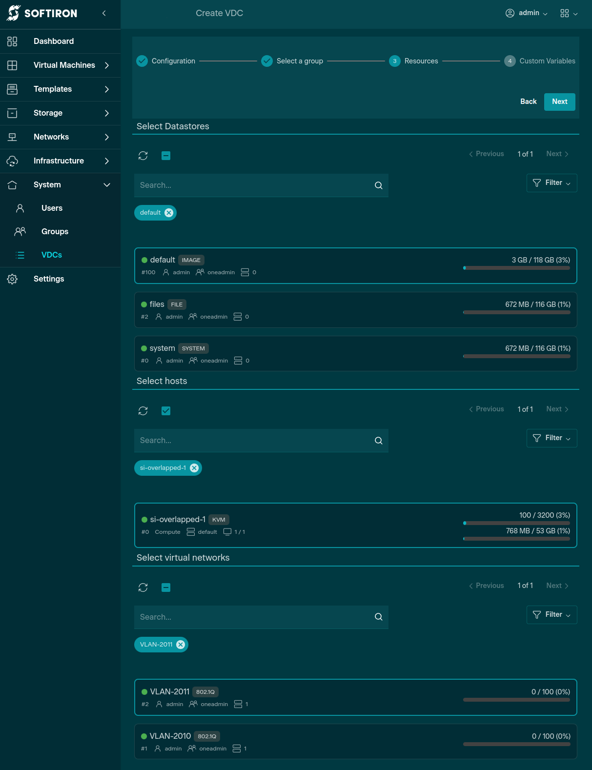 To create a new VDC, navigate to the System → VDCs Menu and click the green + to open the wizard.