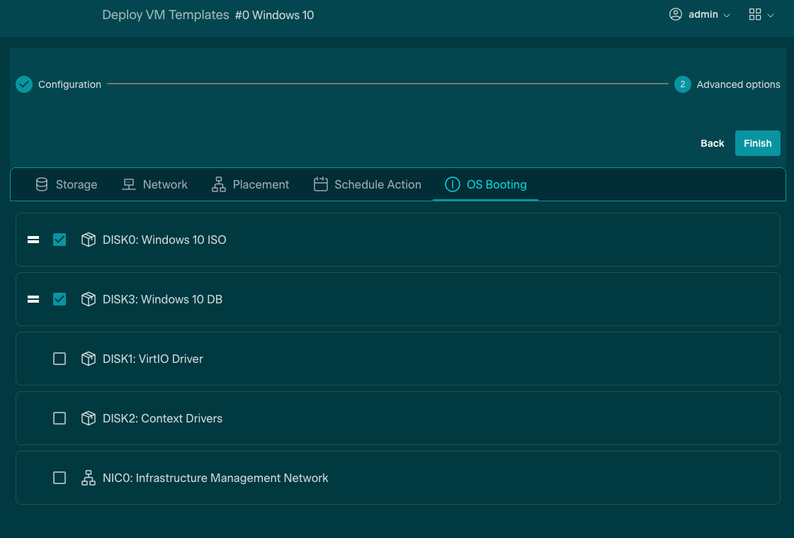 The Template is now ready to be created by pressing the Finish button in the top right of the window. The Windows 10 VM Template is now available to be instantiated from the Templates → VMs menu.