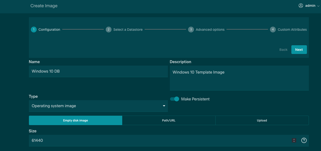 Finally, create an empty disk used for the installation of the operating system. This will need to be classed as an Operating System image, but select the contents to be empty and marked as Persistent. This persistence severs the link between the original Image and any clones, allowing any modifications made to the clone to persist after Termination of the virtual device, and will allow the creation of the Template.