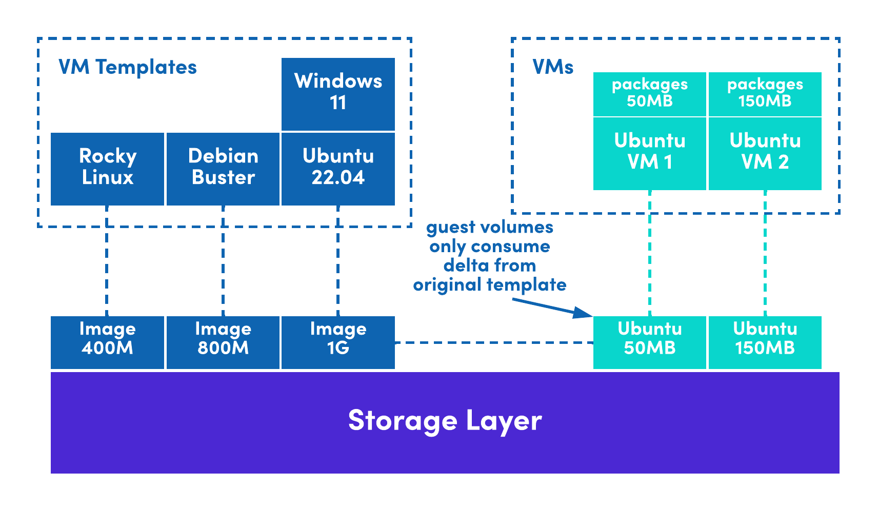 All guest volumes are clones of existing template images - every new guest volume is a COW (copy-on-write) image of its original template. This means that guest volumes only consume new data written to the storage - similar to deduplication.