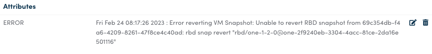 When using the GUI or CLI, a System Reversion is allowed when the VM state is RUNNING; however, an ERROR will occur and post as an Attribute under the Info tab of the VM. The VM must be in a POWEROFF or SUSPENDED state before the reversion action.